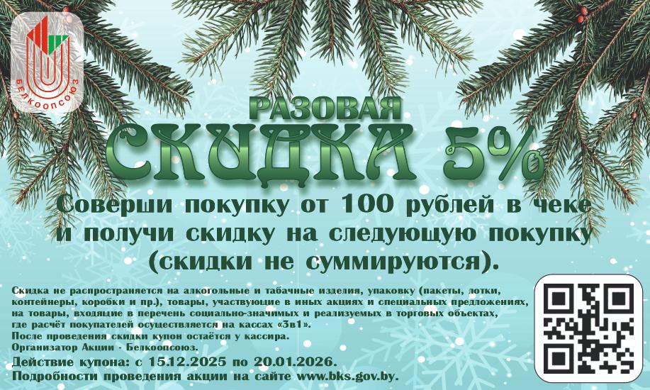 Новогодний купон: скидка 5% на следующую покупку при чеке от 100 рублей